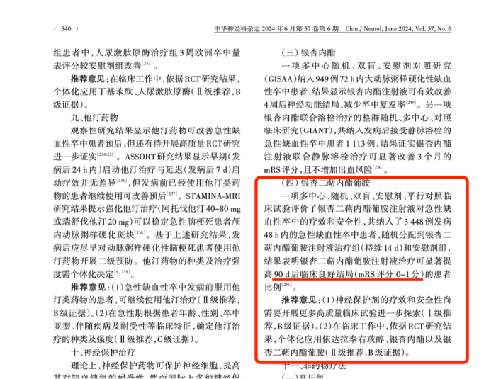6月8日,暌违五年的《中国急性缺血性卒中诊治指南2023》在中华神经科杂志2024年6月第57卷第6期发表,以期体现急性缺血性卒中全面诊治管理的最新规范,指导临床医师工作。基于神经保护的多项国内外RCT研究,推荐个体化应用银杏二萜内酯葡胺等(Ⅱ级推荐,B级证据)。以下截取自原文: