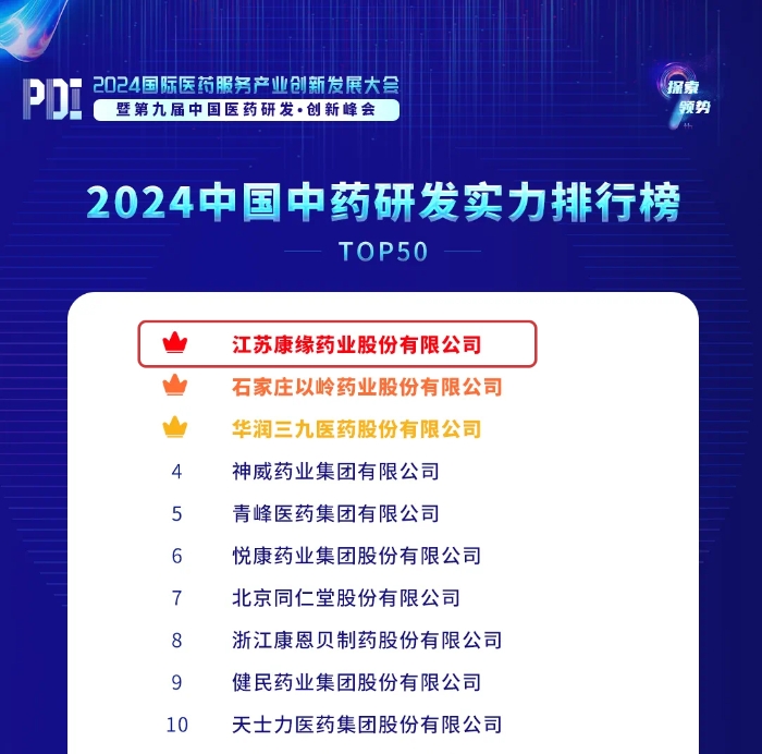 7月4日-5日,“2024国际医药服务产业创新发展大会暨第九届中国医药研发·创新峰会”在中国·雄安会展中心隆重开幕。其中,备受关注的《2024中国中药研发实力排行榜》正式揭晓。新浦京电子娱乐网站再次夺得“中药榜”状元之位,表明了康缘药业的研发实力和创新水平得到专家委员会的肯定以及行业的充分肯定与认可。